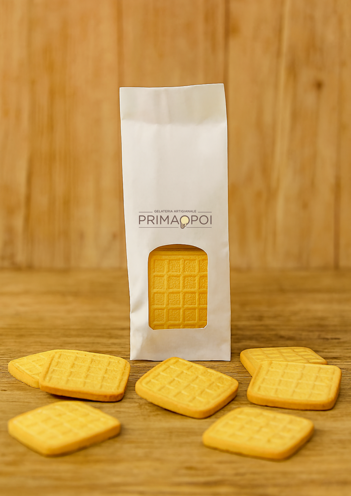 Mix di farine senza glutine (Amido di mais, fibre vegetali (psyllium, inulina), fruttosio, addensanti: guar, E464; farina di mais tostata, enzimi.) (33,5 %), Margarina vegetale (grassi vegetali (palma, cocco), acqua, oli vegetali (girasole e soia in proporzioni variabili), sale, emulsionante: mono e digliceridi degli acidi grassi, aromi naturali, correttore di acidità: acido citrico, coloranti: caroteni), Farina di riso, Zucchero, Uova, Tuorlo d'uovo, Sale, Lievito (agenti lievitanti: E450i, E500ii, amido)